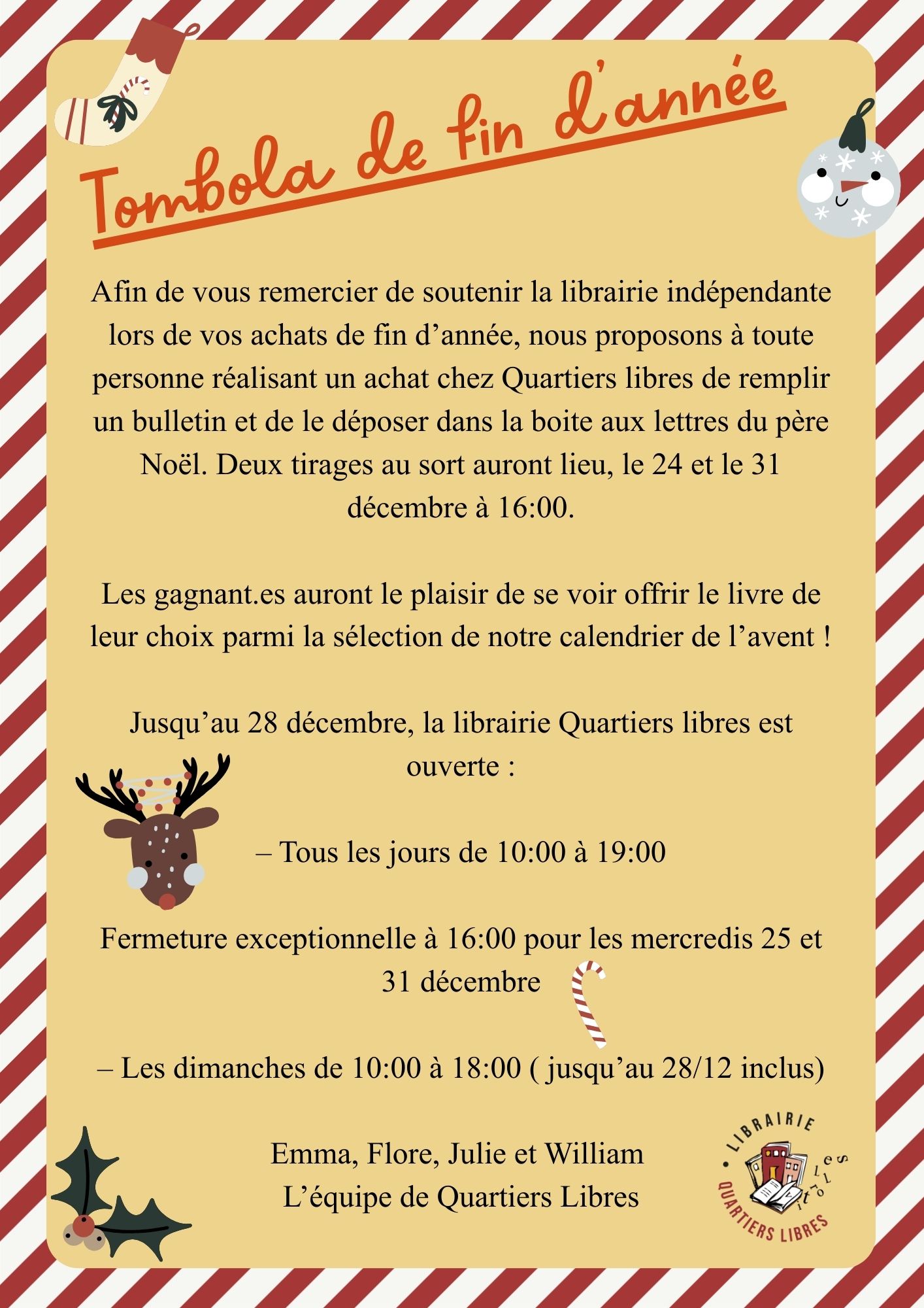 Nous sommes convaincues du rôle unique de la librairie de centre-ville, qui tisse avec ses clients, avec les acteurs·rices locaux·ales et culturel·elle·s des liens privilégiés. Nous voulons que Quartiers libres devienne cet essentiel.